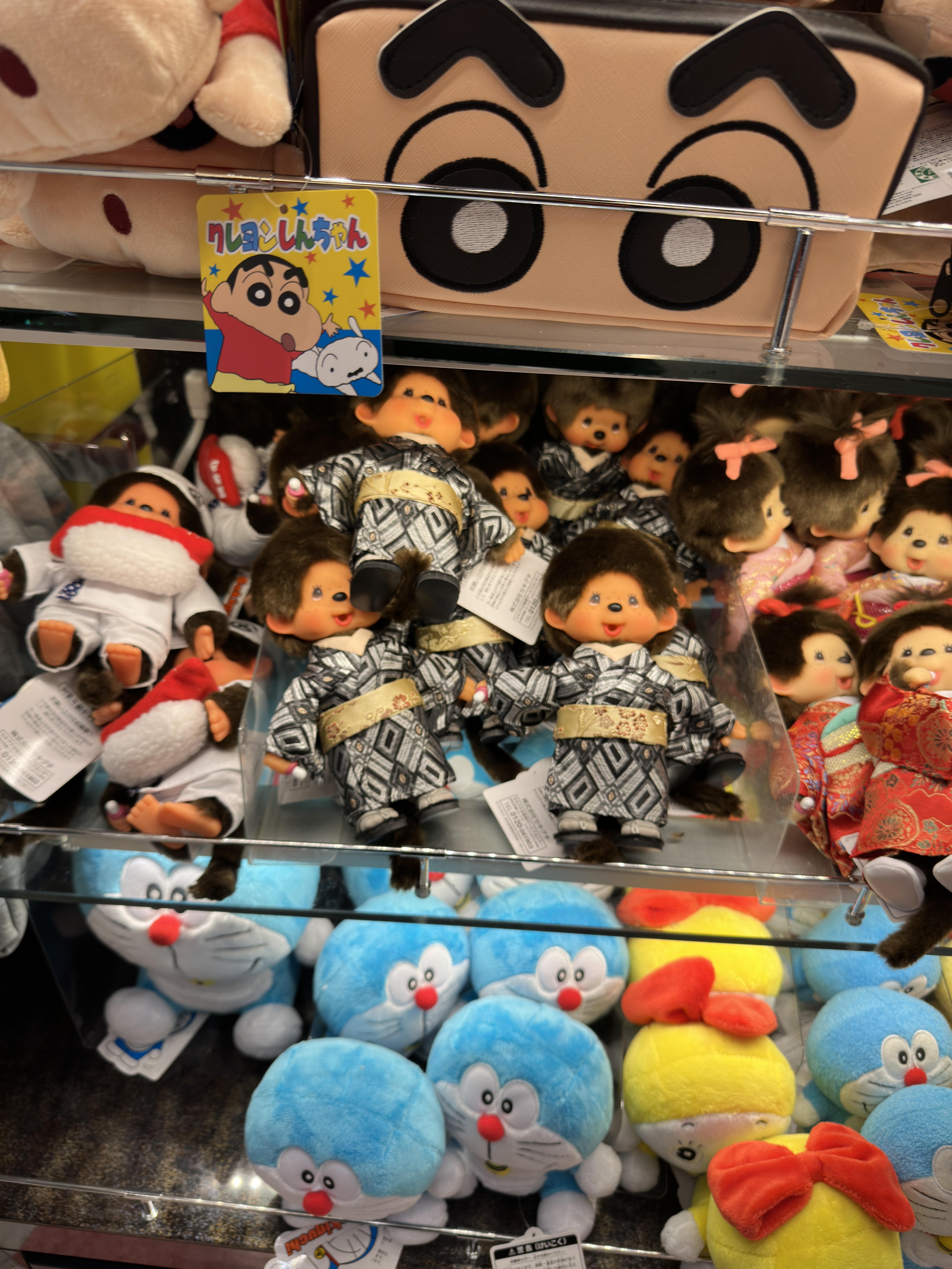 너무 귀여운 도라에몽 녀석, 짱구까지. 거기에 몬치치까지 있잖아요? 몬치치는 일본에서도 오래된 인형중 하나죠. 다양한 옷과 디자인으로 나오는데 여기에 있는건 일본 전통 의상을 입고 있는 몬치치였어요~!
